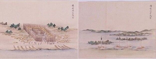 【間宮林蔵が記録したデレンの写生画(左図)。柵の周囲には諸民族の仮小屋が建つ。デレンから対岸を見た写生画(右図)。】